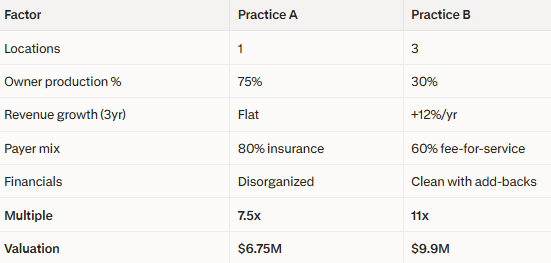 ILLUSTRATIVE SCENARIO: Two Dental Practices, Same Revenue, Very Different Multiples